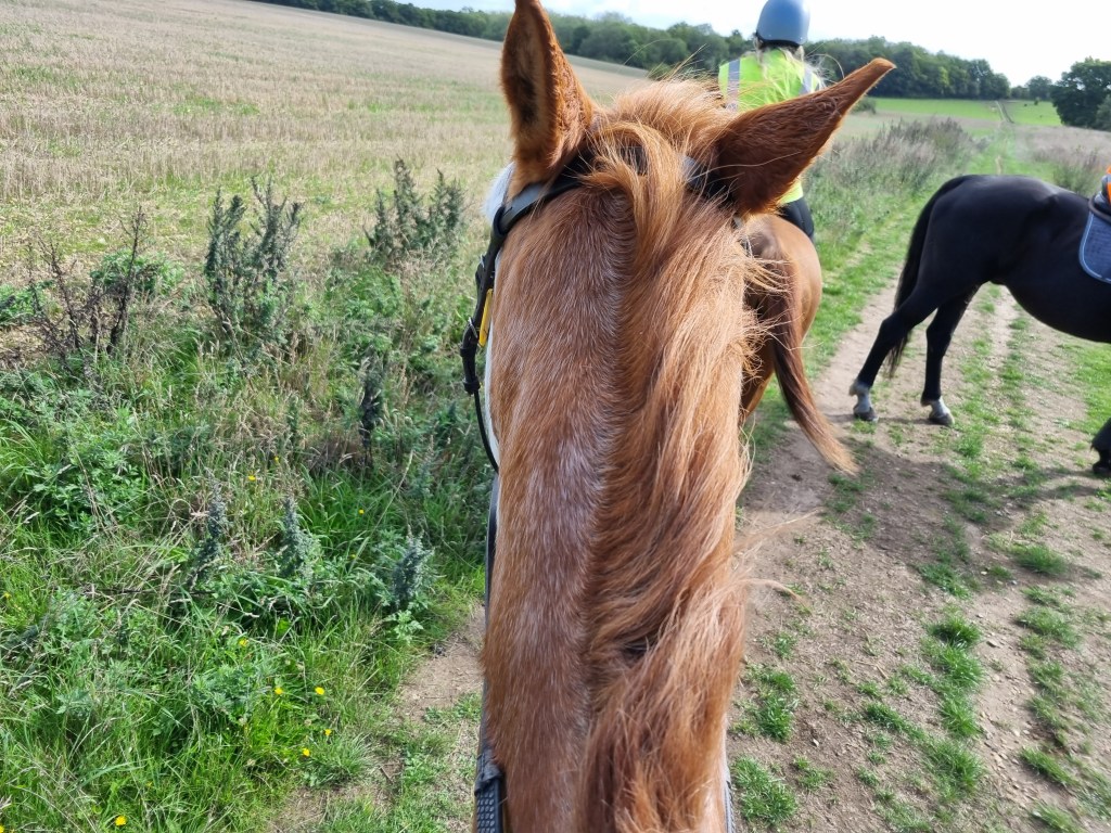 My other birthday treat was to go on a hack on a quiet Monday morning. This included my first time riding on a road – complete with actual cars on it – and I’m pleased to say it went well. Most of the hack, though, was through beautiful fields and woods, and I had a lovely, relaxing time. I include a wonky picture of the back of Tyson’s head as proof that I’m not making up the horse riding thing.