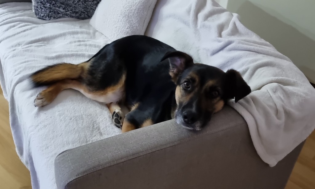 I had a visitor at Black Cat HQ for the beginning of March. My sister and her partner went off on holiday for a week, and so their furry pride and joy came to stay with me. Oscar, my cat, wasn’t particularly keen on sharing his house with a clumsy food-thief, but he managed to cope. Here’s Rocky looking tiny and adorable on the sofa he entirely took over – this is very much in contrast to what he looked like when he realised he could get a good look into the neighbours’ gardens from the top of my shed. It’s not easy to get a twenty-kilogram dog off a roof when he’s decided he quite likes it up there.